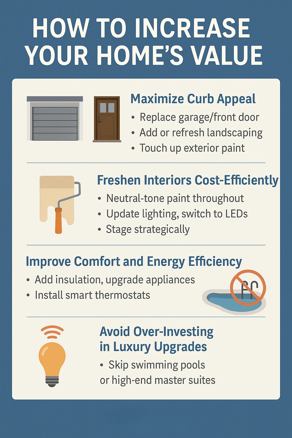 Bottom line: Focus on high-ROI, broadly appealing upgrades. Exterior improvements, landscaping, and modest kitchen or bath refreshes give you the most bang for your buck.
