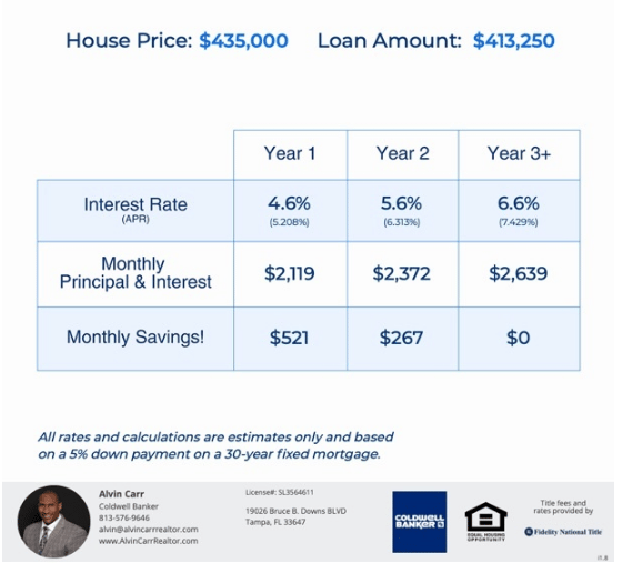 - It works like this: During the first year of the mortgage, the interest rate is reduced by 2 percent and 1 percent the second year. So if you get a 7 percent interest rate on a 30-year fixed mortgage, you’d pay 5 percent the first year, 6 percent the second year, and 7 percent for the remaining life of the loan.